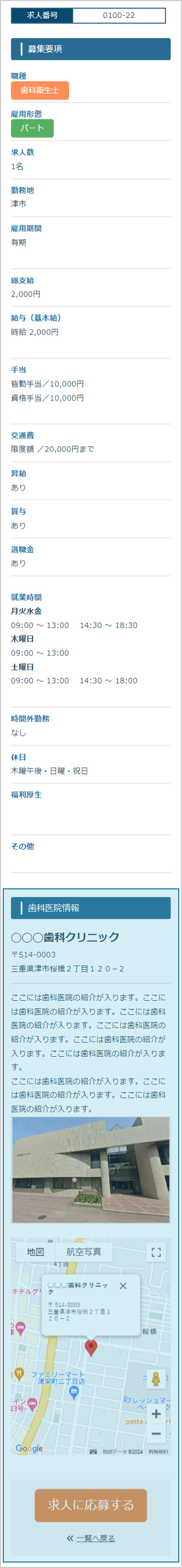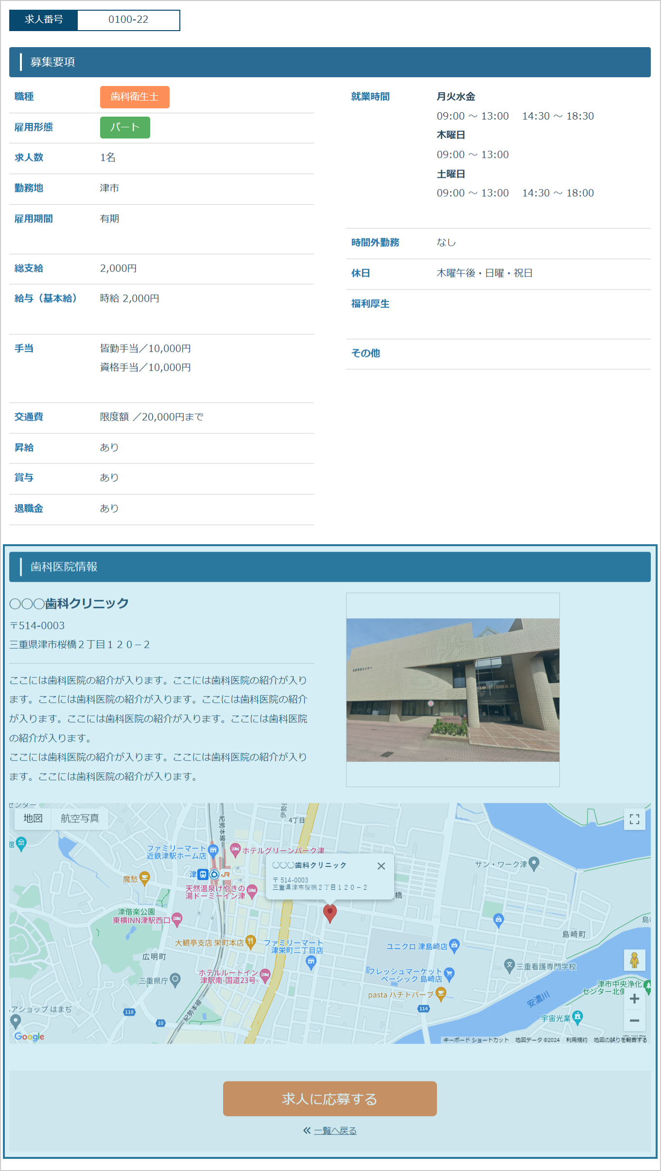 求職者の方がログイン状態の時は下段に歯科医院情報・応募ボタンが表示されます。